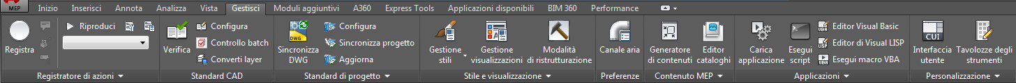 Nella scheda Gestisci sono disponibili funzionalità per utenti avanzati e amministratori CAD.