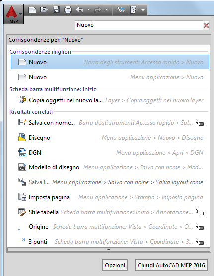 Nel menu dell'applicazione è possibile eseguire la ricerca di un comando e quindi selezionarlo dall'elenco dei risultati restituiti. I risultati della ricerca vengono recuperati dalle posizioni seguenti: