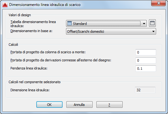 - In Valori di design, per Dimensionamento in base a selezionare Offset/Scarichi domestici.