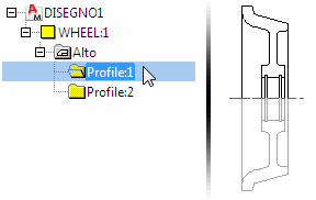 In questo esempio, la cartella Profile:1 contiene il profilo della ruota superiore. Profile:2 è un'altra istanza di questa cartella, creata tramite l'operazione di copia speculare di Profile:1. La modifica di un profilo aggiorna automaticamente l'altro.
