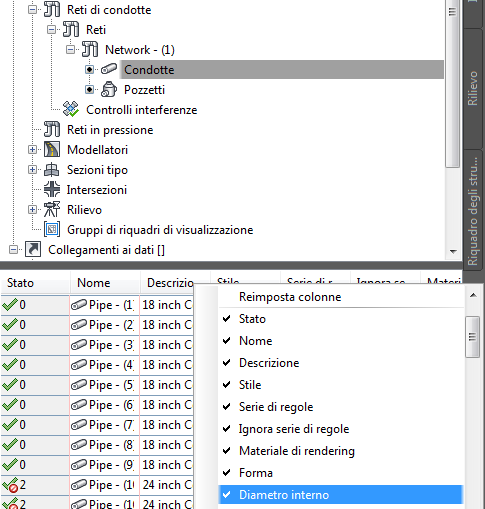È possibile modificare rapidamente gli stili di molte condotte o pozzetti nella scheda Prospetto per la rete di condotte, come illustrato nella figura 3.