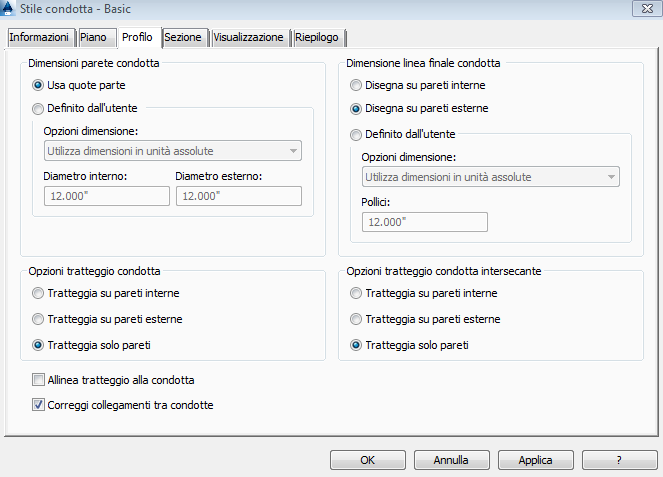 Utilizzare l'opzione Correggi collegamenti tra condotte nella finestra di dialogo Stile condotta, come illustrato nella figura 4, per migliorare l'aspetto dei profili delle condotte in modo che le condotte risultino allineate come previsto. Questa opzione non è attivata di default, pertanto è necessario selezionarla.