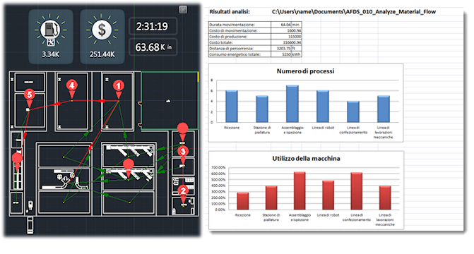 È possibile analizzare il layout di fabbrica in funzione dei costi di movimentazione e dell'utilizzo delle macchine. Quindi, è possibile modificare il layout e ripetere l'analisi per ottimizzare il layout di fabbrica.