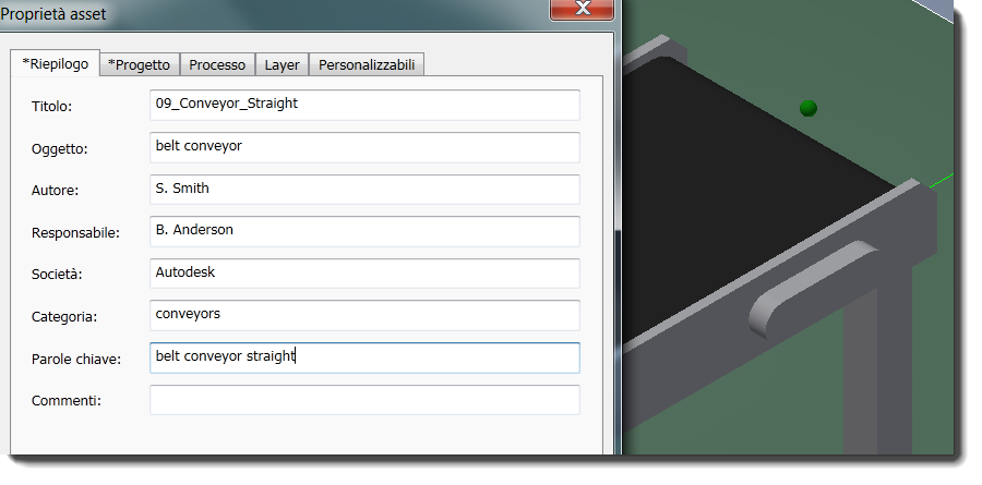 Le schede Proprietà asset riorganizzate ed espanse consentono di predefinire i dati dell'asset utilizzati da AutoCAD, Inventor e Process Analysis 360.