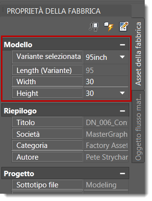 Le proprietà in Personalizzabili ora includono un'opzione di categoria che consente di organizzare le informazioni per la creazione di rapporti. Queste categorie vengono visualizzate anche nel browser Proprietà della fabbrica.