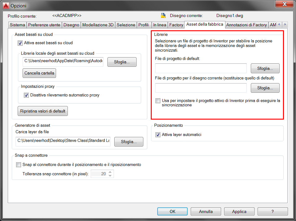 Per condividere le librerie di asset tra AutoCAD e Inventor, è necessario definire le impostazioni del file di progetto di Inventor come riferimento per l'individuazione degli asset e per la sincronizzazione dei dati degli asset tra AutoCAD e Inventor.