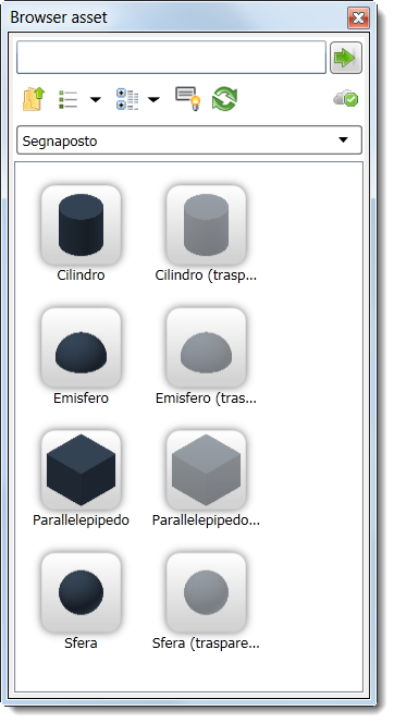 Parallelepipedi, cilindri, sfere e emisferi solidi e trasparenti vengono installati con Factory Design Suite e vengono memorizzati nella cartella degli asset di sistema Segnaposto.