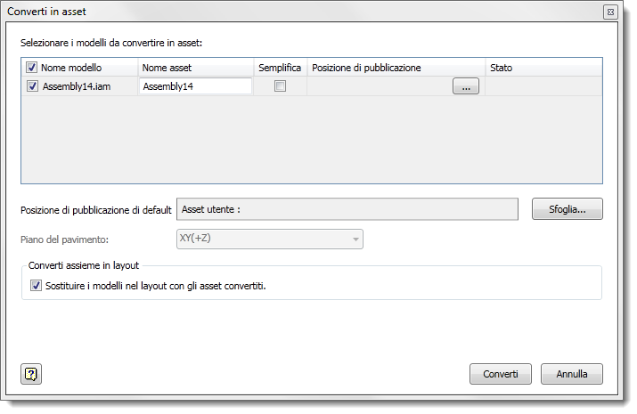 - Selezionare Sostituire i modelli nel layout con gli asset convertiti per sostituire automaticamente il modello nel layout corrente con gli asset appena creati. Se non si seleziona questa opzione, gli asset vengono ancora creati e aggiunti alla libreria degli asset utente, ma il modello rimane nel layout.