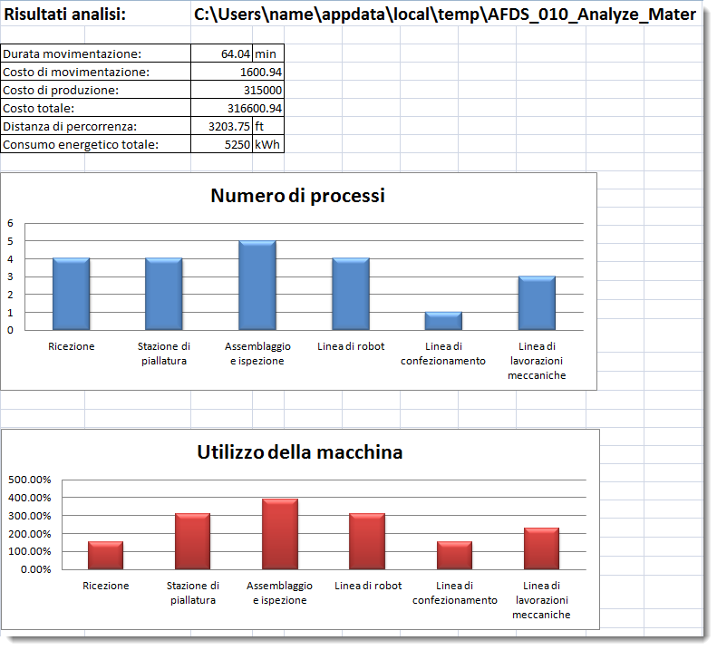 Per tipi di movimentazione continua: Se (tempo di preparazione + tempo di lavorazione) * dimensioni lotto < (lunghezza linea di connessione / velocità di percorrenza) somma di (tempo di preparazione + tempo di lavorazione) * dimensioni lotto * costo unitario movimentazione per tutti i processi In caso contrario: somma di (lunghezza linea di connessione / velocità di percorrenza + tempo di caricamento + tempo di scaricamento) * (arrotondamento (quantità parte del processo / dimensioni lotto)) * costo unitario movimentazione per tutti i processi Per tipi di movimentazione non continua: somma di (lunghezza linea di connessione / velocità di percorrenza + tempo di caricamento + tempo di scaricamento) * (arrotondamento (quantità parte del processo / dimensioni lotto)) * costo unitario movimentazione per tutti i processi |