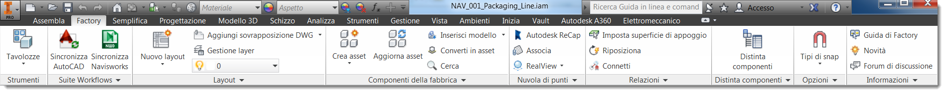 Gli strumenti di questo gruppo consentono di creare un collegamento associativo bidirezionale tra un disegno AutoCAD 2D e un layout 3D in Inventor Factory e Navisworks Factory. Il collegamento, denominato Sincronizza layout, può essere stabilito tra Inventor o Navisworks e AutoCAD Architecture o AutoCAD Mechanical. Da qui è inoltre possibile accedere al flusso di lavoro Crea modello di processo che consente di sincronizzare i dati di Inventor con Process Analysis 360, per poter analizzare e ottimizzare i processi di produzione. Sincronizza Navisworks apre il file di Inventor attivo in Navisworks per una visualizzazione più dettagliata e il rilevamento delle interferenze.