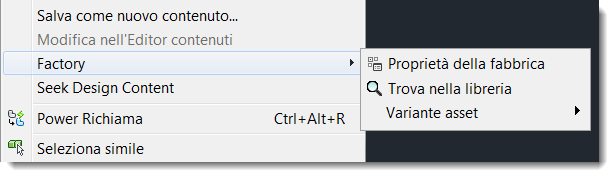 Tutti i comandi di menu correlati a Factory (Proprietà della fabbrica, Trova nella libreria, Variante asset e Converti in asset) sono accessibili facendo clic con il pulsante destro del mouse su un asset per visualizzare il menu contestuale.
