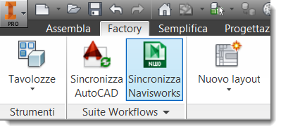 Il comando Sincronizza Navisworks ora viene visualizzato nella barra multifunzione di Inventor e introduce ulteriore simmetria con le funzionalità di AutoCAD. Fare clic sul comando in Inventor per sincronizzare il layout attivo con Navisworks. Il file di assiemi viene salvato in formato NWF per migliorare le prestazioni all'interno dell'ambiente Navisworks.