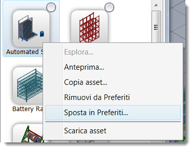 Per spostare un asset da una cartella Preferiti ad un'altra, individuare l'asset in Preferiti, fare clic con il pulsante destro del mouse e selezionare Sposta in Preferiti. Con questo menu è inoltre possibile rimuovere un asset da una cartella. Tenere presente che la rimozione di un asset da una cartella Preferiti non comporta l'eliminazione dell'asset dalla libreria.