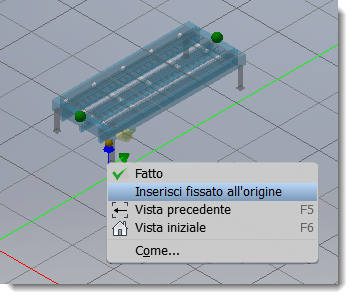 Il nuovo comando di Inventor Inserisci fissato all'origine consente di posizionare e fissare un modello in corrispondenza dell'origine del layout (0,0,0). Durante il posizionamento di un asset, fare clic con il pulsante destro del mouse per accedere al comando dal menu contestuale.