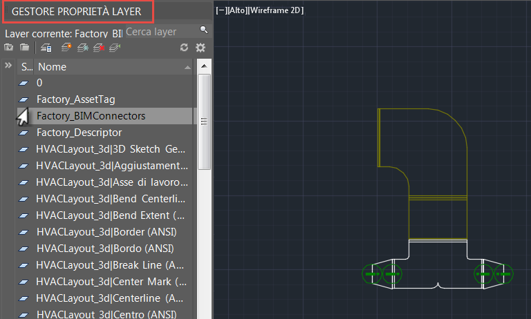 È anche possibile visualizzare i connettori BIM della fabbrica in Gestore proprietà layer, a cui è possibile accedere immettendo LAYER nella riga di comando.