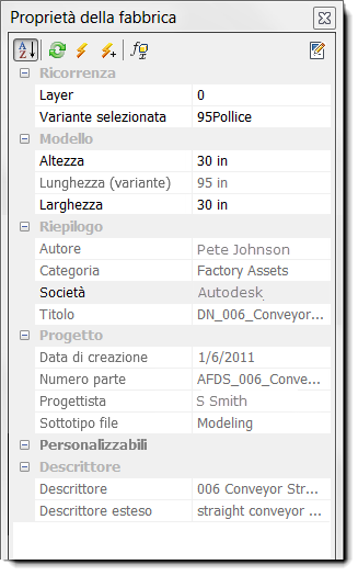 Proprietà della fabbrica vengono inseriti i dati dell'asset. Le informazioni sono organizzate nelle seguenti categorie. Se un campo è disabilitato, il valore non può essere modificato. Se per una categoria non è definito un asset, la categoria non viene visualizzata.