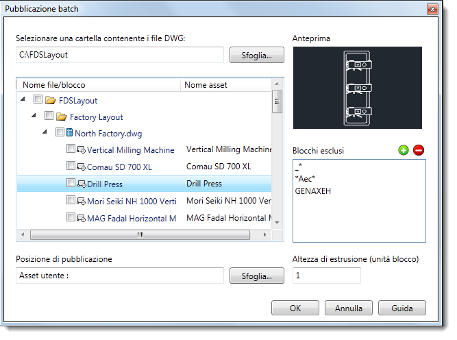 Convertire rapidamente e facilmente i blocchi nei file DWG esistenti in asset della fabbrica. Fare clic su Pubblicazione batch per visualizzare file DWG nella struttura del file corrente e selezionare uno o più blocchi da convertire.