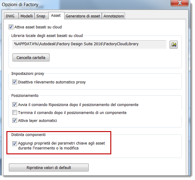 Dalla scheda Asset in Opzioni di Factory è possibile abilitare o disabilitare la funzione della distinta componenti che espone i dati dei parametri chiave come iProperty. Quando questa opzione è selezionata, tutti i parametri chiave vengono inseriti in un'unica iProperty denominata Parametri chiave.