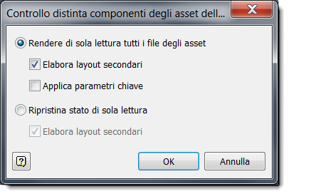 Tuttavia, se si fa clic sul comando "Controllo asset", si seleziona "Reimposta tutti i file degli asset nello stato di sola lettura", quindi si sceglie OK, viene visualizzata la seguente finestra di dialogo: