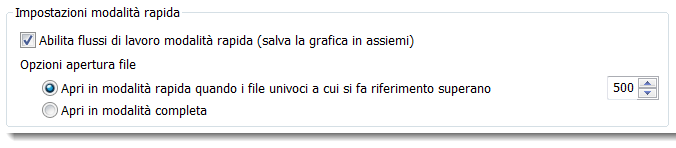 Se l'opzione è abilitata, la modalità rapida viene attivata automaticamente quando un file supera le dimensioni impostate. Il comando Apri in modalità completa disattiva la modalità rapida e consente il caricamento di tutti i dati del componente ogni volta che viene aperto un layout.