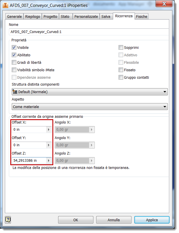 Nota: Offset Z rappresenta la superficie di appoggio selezionata, pertanto non è necessario modificarla.
