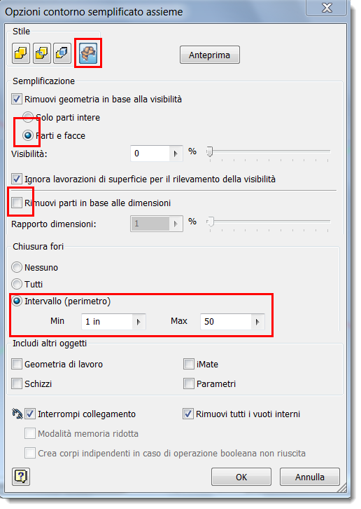 Disattivazione del dettaglio degli assiemi (facoltativo)