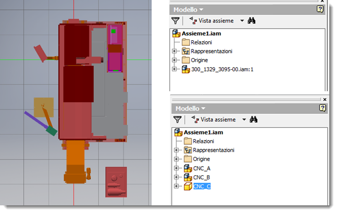 - Ripetere il passaggio 2 finché tutti gli elementi sono strutturati come desiderato. In questo esempio, il file è ristrutturato per convertire tre elementi (CNC_A, CNC_B, CNC_C) in asset e per mantenere la relazione tra essi.