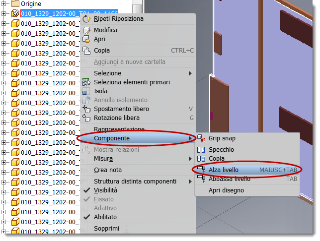 - Individuare un elemento da convertire in un asset. Fare clic con il pulsante destro del mouse, selezionare Componente, quindi Alza livello.