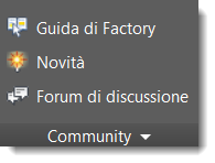 - Il Forum di discussione porta direttamente agli argomenti in linea delle discussioni su Factory. Qui è possibile leggere argomenti, porre domande o rispondervi e interagire con altri utenti che utilizzano gli strumenti di Factory Design. Il forum di discussione è anche il luogo ideale in cui pubblicare i miglioramenti auspicati nelle release future del prodotto.