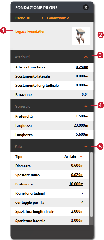 Quando si seleziona una fondazione pilone, verrà visualizzata la relativa scheda delle risorse.