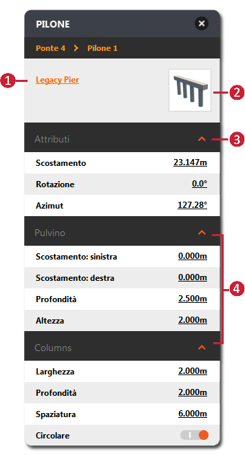 Scegliere uno stile pilone per il ponte da un catalogo di componenti pilone parametrici, quindi modificare le proprietà del pilone secondo le esigenze.