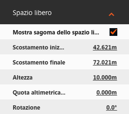 - Per modificare la posizione e la rotazione della sagoma dello spazio libero, fare clic su un valore accanto a Scostamento iniziale e/o Scostamento finale, Quota altimetrica di base o Rotazione. Immettere i valori desiderati, quindi premere INVIO.