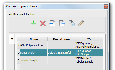 È possibile utilizzare gli strumenti icona dell'interfaccia standard per aggiungere, eliminare, importare ed esportare un file delle precipitazioni, creare una copia del contenuto precipitazioni attualmente selezionato o modificarlo nella finestra Rainfall IDF.