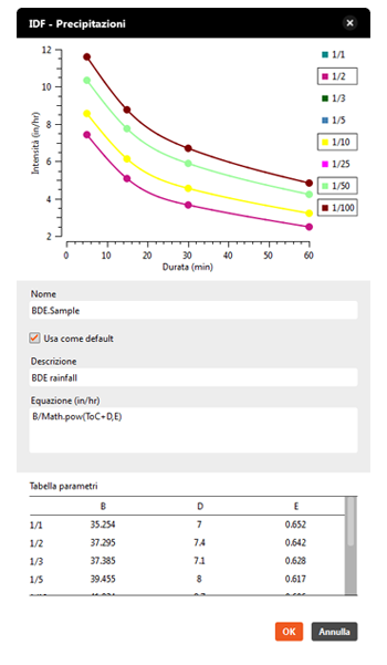 , Contenuto precipitazioni, consente di specificare una curva IDF che si adatta perfettamente alle esigenze di progettazione di drenaggio del modello in uso. Vedere Informazioni sul contenuto precipitazioni per una panoramica dello strumento.