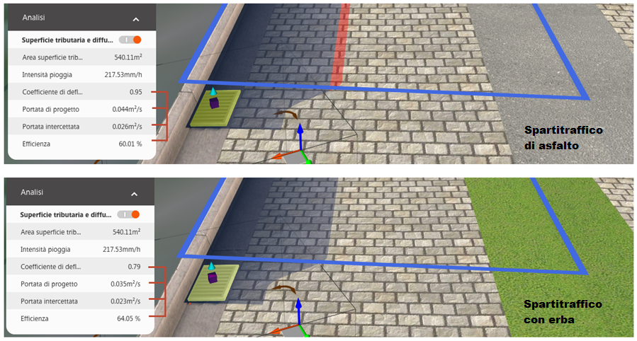 L'analisi presa tiene conto delle differenze in coefficienti di deflusso per diversi tipi di materiali utilizzati in una strada. Nel confronto sottostante, i dati di analisi nella scheda delle risorse mostrano l'effetto della sostituzione di uno spartitraffico inclinato di asfalto con uno spartitraffico con erba mantenendo invariate la presa e le condizioni. Notare che il valore di diffusione ottenuto utilizzando l'asfalto supera la diffusione consentita consigliata (area rossa). In questo caso, il passaggio ad uno spartitraffico ricoperto d'erba corregge questa condizione.