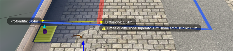 Nell'area di disegno è possibile esaminare visivamente la captazione, la diffusione e la portata passante. Nella scheda delle risorse della presa, in Analisi, è possibile visualizzare i dati relativi alla presa, tra cui coefficiente di deflusso, portata di progetto, portata intercettata ed efficienza (percentuale). In Drainage Design i dati vengono ricalcolati in tempo reale, mentre è in corso la modifica della posizione o delle dimensioni della presa.