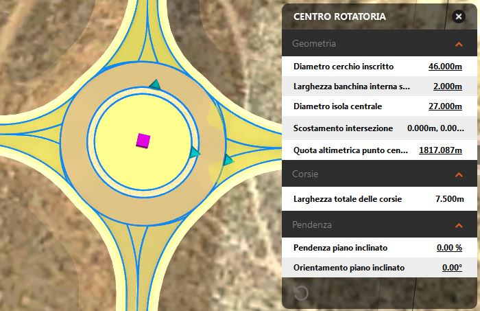 per ridimensionare la geometria della banchina interna della rotatoria, dell'isola centrale o del diametro del cerchio inscritto. È possibile trascinare il grip di modifica