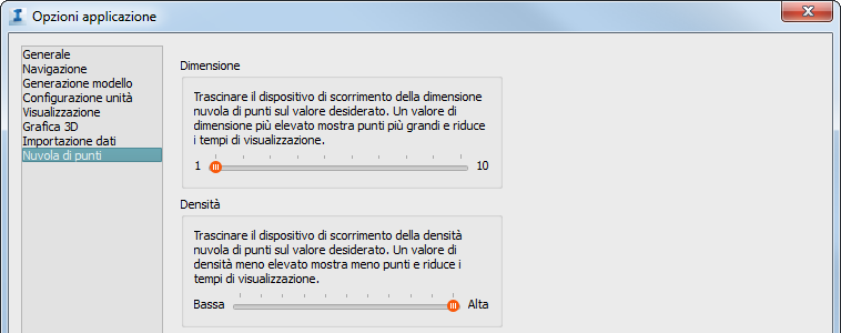 È possibile regolare la dimensione e la densità dei dati relativi alla nuvola di punti. Valori di dimensione superiori e valori di densità inferiori consentono di migliorare la velocità di visualizzazione.