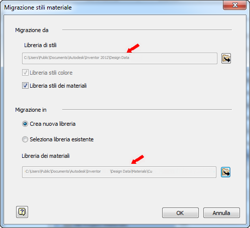 - Nella finestra di dialogo Migrazione stili materiale, specificare la posizione di Migrazione da in cui si trovano i file Materials.xml e Colors.xml. Per impostazione predefinita, il percorso è C:\Utenti\Pubblica\Documenti\Autodesk\Inventor 2012\Design Data in Windows 7.