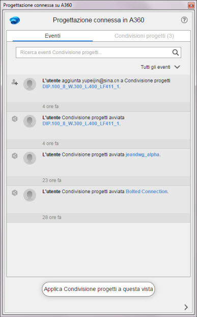 La copia visualizzabile 3D è accessibile anche dall'account di A360 Drive del proprietario e dei collaboratori. Nella cartella CONDIVISI CON L'UTENTE CORRENTE vengono visualizzati i collegamenti a tutte le condivisioni di progetti che sono condivise con l'utente. La cartella Condivisioni progetti di Inventor contiene tutte le condivisioni dei progetti di proprietà dell'utente.