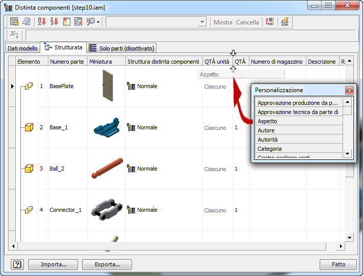 Il valore Aspetto del modello viene aggiunto come proprietà selezionabile. È possibile aggiungere la proprietà Aspetto a una distinta componenti o ad un elenco parti.