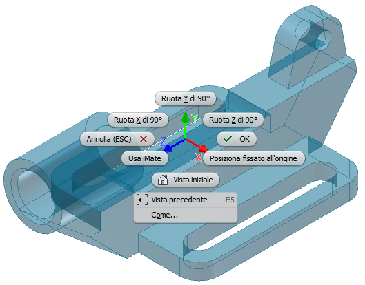 Una nuova opzione dell'assieme dell'applicazione specifica se fissare il primo componente posizionato in corrispondenza dell'origine. Questa opzione è disattivata per default. Per fissare qualsiasi componente in corrispondenza dell'origine, utilizzare il menu contestuale. Il menu contiene nuove opzioni per ruotare i componenti con incrementi di 90 gradi attorno all'asse X, Y o Z, prima di posizionarli nell'assieme.