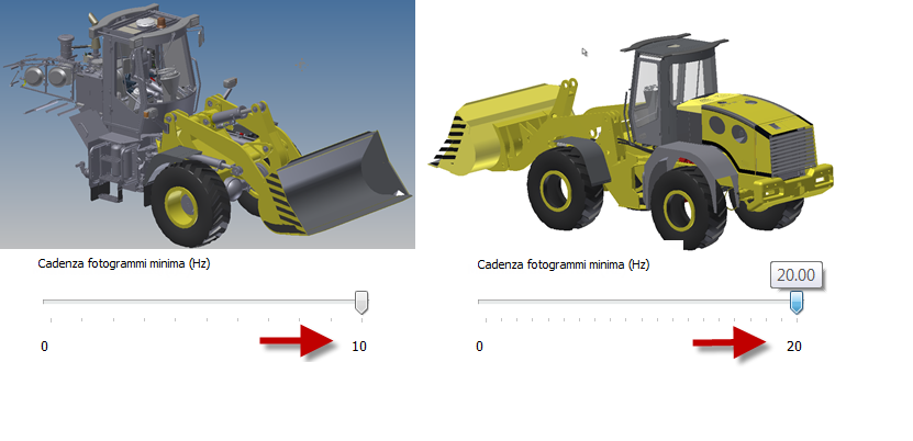 Nelle immagini seguenti, il modello 2013 sulla sinistra visualizza i risultati della rotazione del modello utilizzando la cadenza fotogrammi massima di dieci fotogrammi al secondo. L'aumento della cadenza fotogrammi aumenta la velocità, ma la scelta dei componenti da disegnare non è intelligente. Il modello 2014 a destra mostra i risultati della rotazione alla cadenza fotogrammi massima di 20 Hz. Il modello resta riconoscibile e tutte le operazioni di visualizzazione sono più veloci.