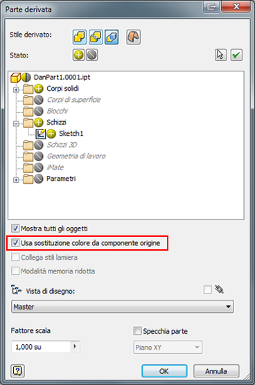 Una nuova opzione Usa sostituzione colore da componente origine è disponibile nelle finestre di dialogo Assieme derivato, Parte derivata, Crea parte e Crea componenti. Questa casella di controllo, se selezionata, consente l'invio delle sostituzioni colore dell'aspetto e del corpo della parte, della lavorazione o del colore della faccia applicate alle facce dalla parte derivata alla nuova parte. Se non è selezionata, viene utilizzato l'aspetto di default.