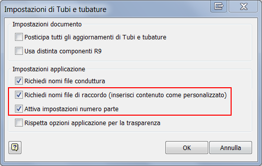 Aggiornamenti alle opzioni della finestra di dialogo nell'ambiente Tubi e tubature:
