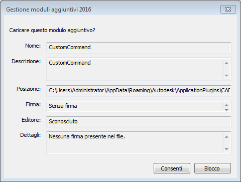 Quando viene caricato un modulo aggiuntivo di un prodotto non Autodesk, viene visualizzata una nuova finestra di dialogo. Ora è possibile scegliere di consentire o bloccare il caricamento di un modulo aggiuntivo. Questa impostazione viene mantenuta per le sessioni successive. È possibile esaminare e modificare le impostazioni Consenti/Blocco utilizzando Gestione moduli aggiuntivi.