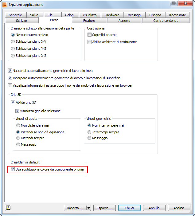 È possibile configurare un'impostazione globale in modo che la casella di controllo Usa sostituzione colore da componente origine resti selezionata o deselezionata di default per tutta la durata della sessione. È possibile accedere a questa casella di controllo tramite la finestra di dialogo Opzioni applicazione in Crea/deriva default, nella scheda Strumenti della barra multifunzione.