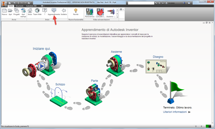 Fare clic sulla voce di apprendimento nella scheda Inizia, gruppo Inizio per accedere a Esercitazioni - Percorso formativo. Le esercitazioni offrono un percorso guidato per l'apprendimento dei concetti di base di schizzi e parti, assiemi e disegni in un flusso di lavoro completo. Il controllo dell'avanzamento mostra quanto è stato completato. L'interfaccia utente ottimizzata per le esercitazioni interattive offre una migliore esperienza visiva.