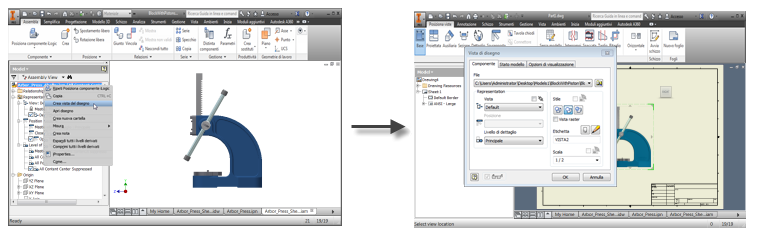 Un nuovo comando Crea vista del disegno consente di unire diversi passaggi in un solo passaggio: in questo modo è possibile creare rapidamente viste del disegno da un file di modello. Nel file di modello, disporre il modello come desiderato. Fare clic con il pulsante destro del mouse sul componente principale nel browser, quindi fare clic su Crea vista del disegno.