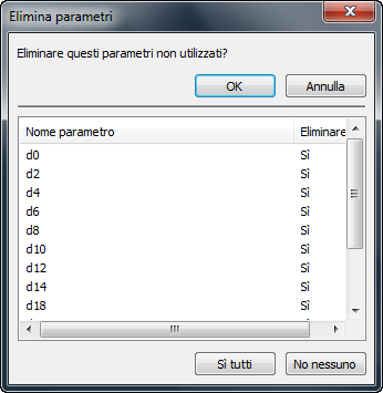 Nella parte inferiore della finestra di dialogo Parametri, l'opzione Elimina inutilizzati elenca tutti i parametri inutilizzati in una finestra separata. È possibile eliminarli con un'unica operazione. Fare clic su Sì tutti per eliminare tutti i parametri non utilizzati del documento oppure su Nessuno per mantenere i parametri non utilizzati nel documento corrente.